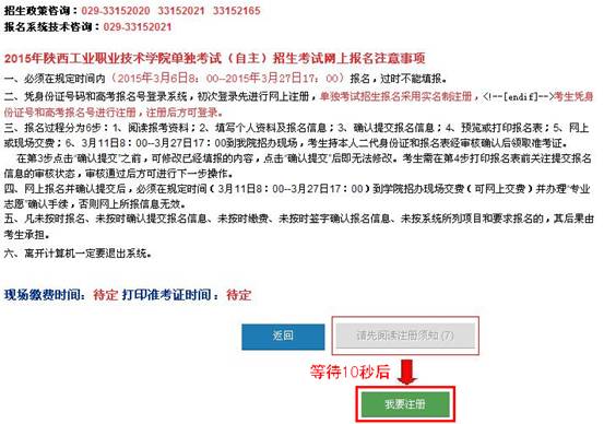 4. 阅读“2015年陕西工业职业技术学院单独考试(自主)招生考试网上报名注意事项”,点击“我要注册”(等待10秒后“请先阅读注册须知”按钮变为“我要注册”按钮);(图12)